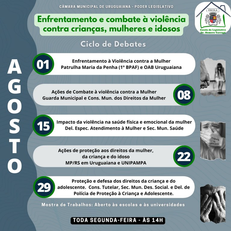 Em agosto, nas segundas-feiras, a Câmara Municipal de Uruguaiana põe em pauta o enfrentamento e combate à violência contra crianças, mulheres e idosos. Por proposição do vereador Clemente Correa, com parceria da Escola do Legislativo Dr. Homero Tarragó, ciclo de debates com o tema será promovido em 2022.
