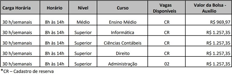 As vagas são destinadas a estudantes de ensino médio, de áreas específica do ensino superior e formação de cadastro reserva, remuneradas através de bolsa-auxílio. Entre os requisitos para ingresso do estágio está a idade mínima de 16 anos, ter o nível de escolaridade exigido para o exercício do estágio do qual se inscreveu; e ter disponibilidade de cumprimento do estágio no horário de expediente da Câmara, das 8h às 14h, de segunda a sexta-feira.